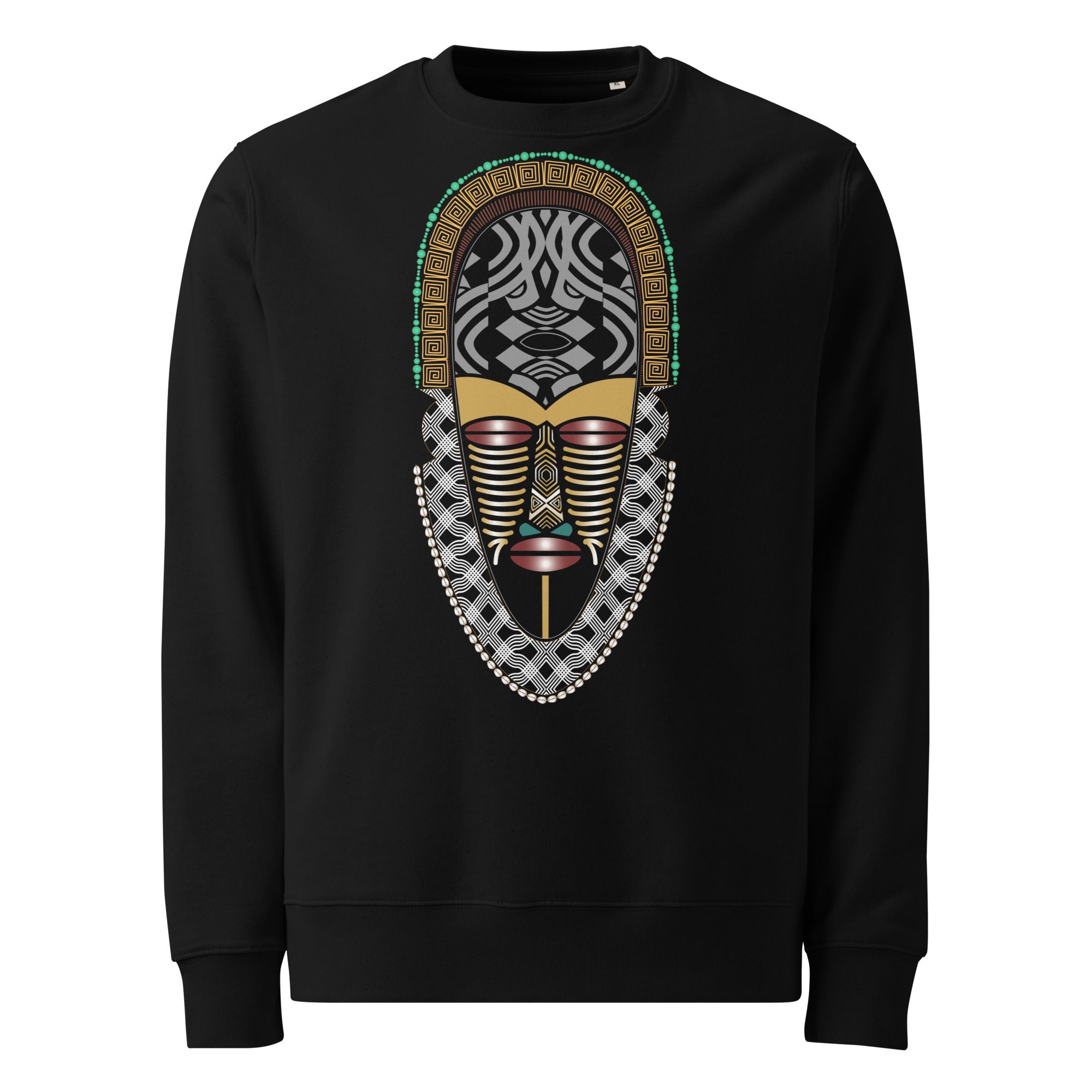 Elevate your style with this unisex eco sweatshirt. Our newest design features a stunning multi-colored, multi-patterned single mask, proudly showcasing the unique craftsmanship of African art. Set against a sleek black background, this t-shirt exudes a sense of sophistication and style that is sure to turn heads.